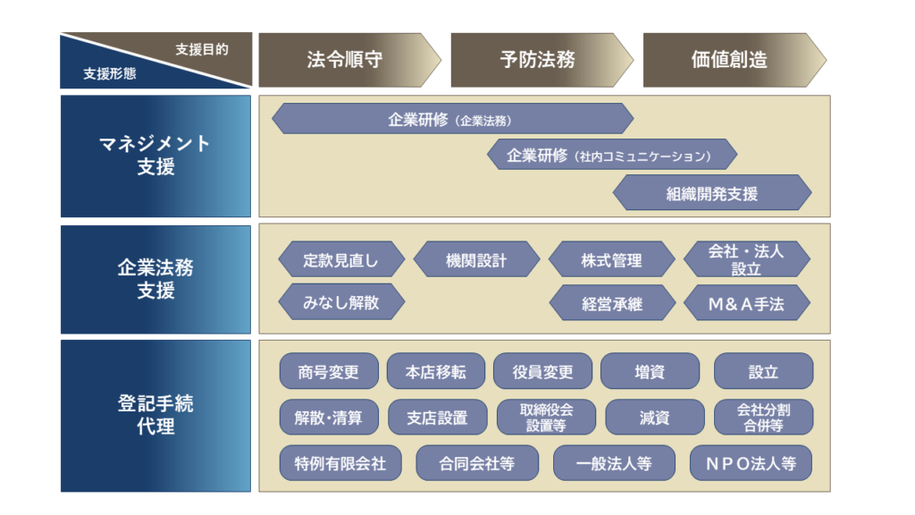 弊所では、司法書士と人材開発コンサルの両方の立場から、企業競争力の源泉である人材の育成・組織活性化をはかるとともに、企業法務の観点から法令順守・予防法務など経営上の想定リスクへの対応をご支援いたします。