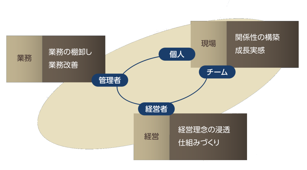 弊所では、人材開発の対象を個人・チーム・業務・経営面に拡げ、現場と業務・現場と経営が有機的に連携する仕組みを図りつつ、現場力の強化を支援いたします。