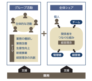 生産性向上や経営理念の共創などを目的としてグループ活動と、関係者(経営者、管理者、チーム、個人)をつなぐ仕組みづくりを目的とした全体シェアを連携させることで現場力強化をはかります。