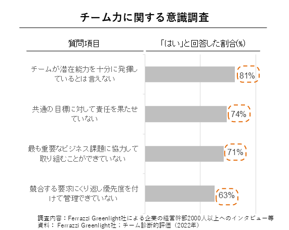 また、海外のチーム力に関する意識調査(Ferrazzi Greenlight社による企業の経営幹部2000人以上へのインタビュー等)によると、「チームが潜在能力を十分に発揮しているとは言えない」に「はい」と回答した割合が81%、「共通の目標に対して責任を果たせていない」に「はい」と回答した割合が74%などとなっています。
