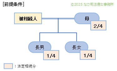 - 法定相続分は、母:4分の2、長男:4分の1、長女4分の1